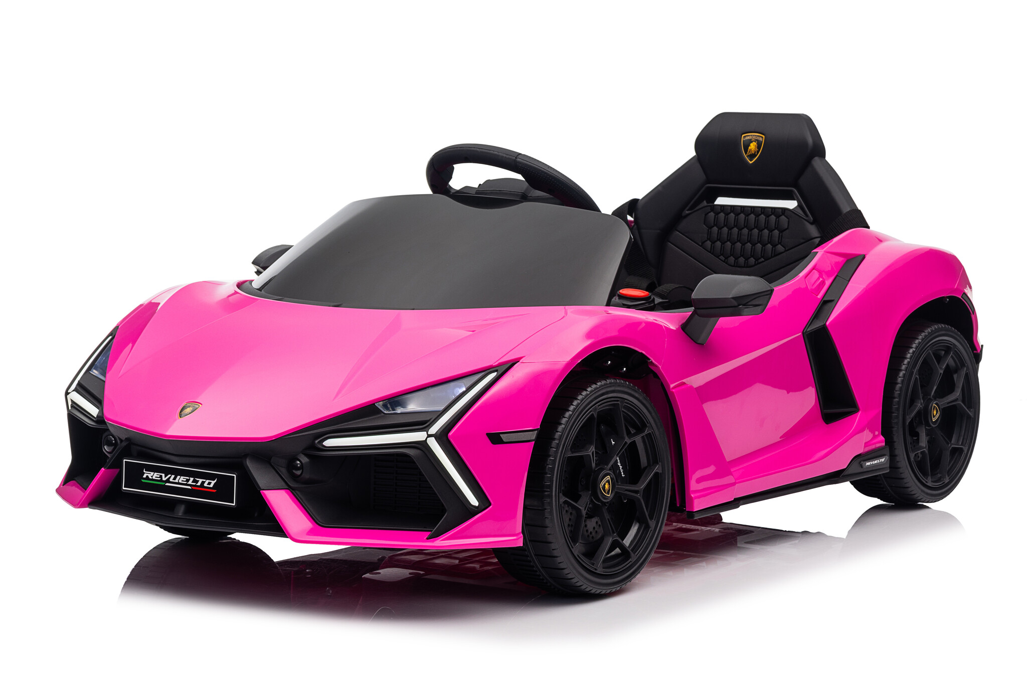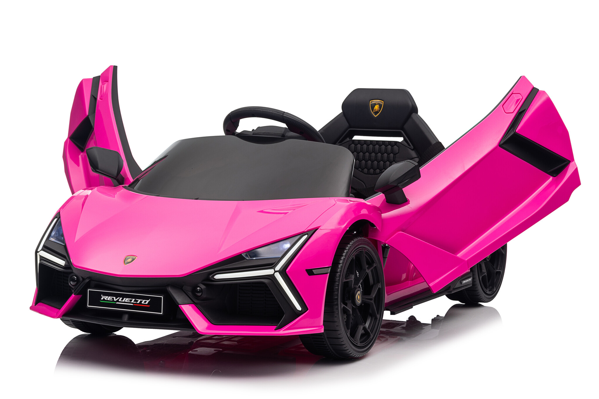 The Lamborghini Revuelto electric children's car with its gull-wing doors is the ultimate experience for children! The black children's car is suitable for children from 1 to 4 years old and offers many options to complete the driving experience for your child.